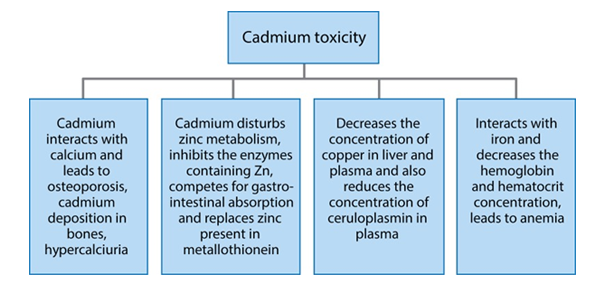 Kadmiyum, toksik etkilerinini görülmesini sağlayan, temel besinlerle etkileşime girer. Hayvanlarda yapılan deneysel analizler, kadmiyumun %50'sinin akciğerlerde ve daha azının gastrointestinal kanalda emildiğini göstermiştir. Erken doğum ve düşük doğum ağırlıkları, insan hamileliği sırasında kadmiyum maruziyetinin yüksek olması durumunda ortaya çıkan sorunlardır.
